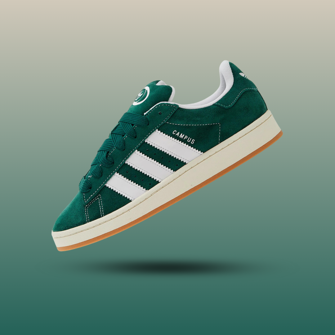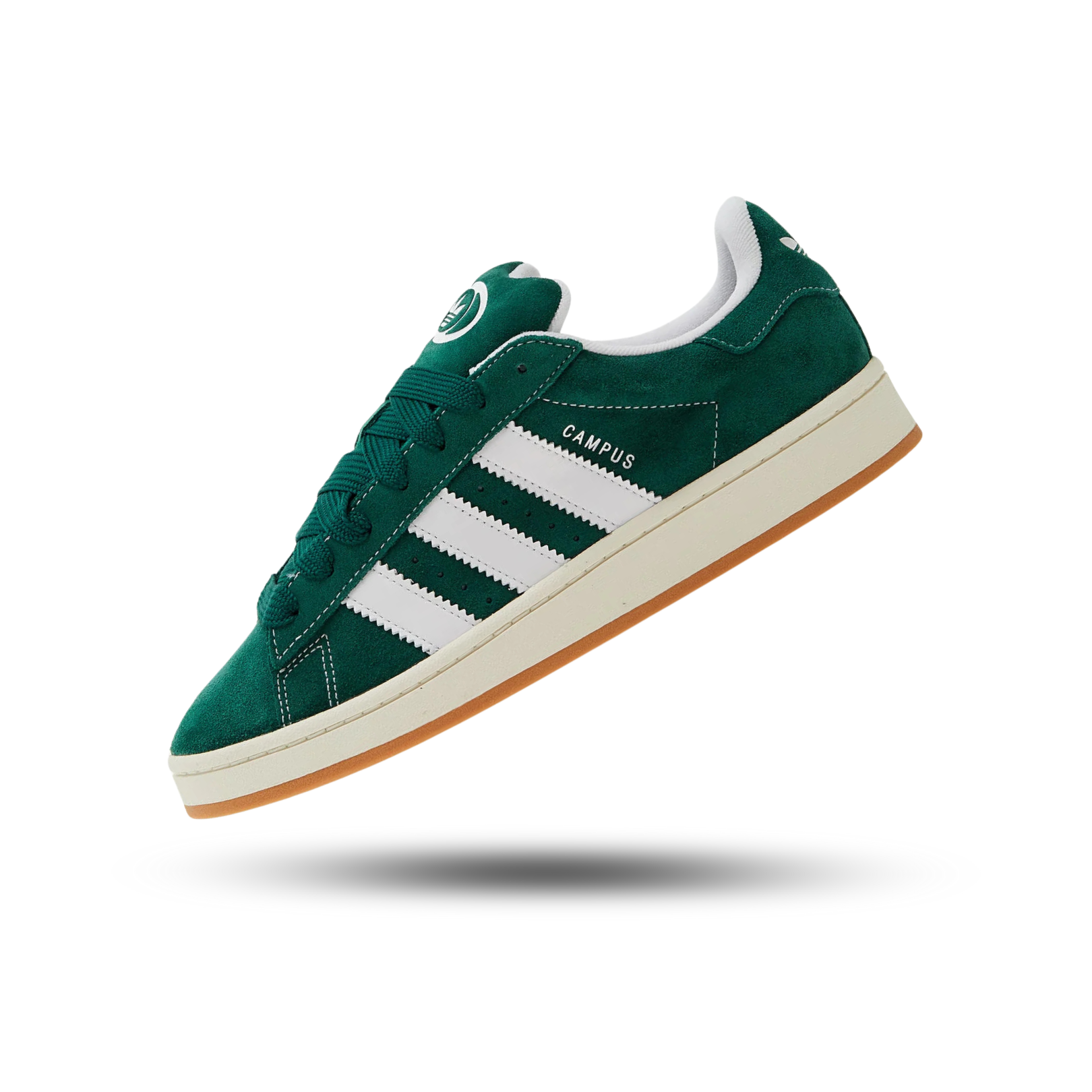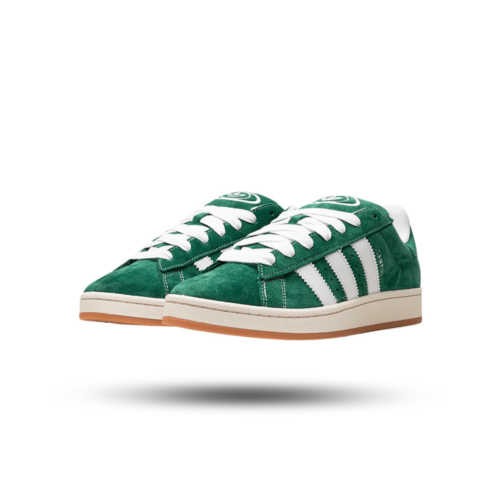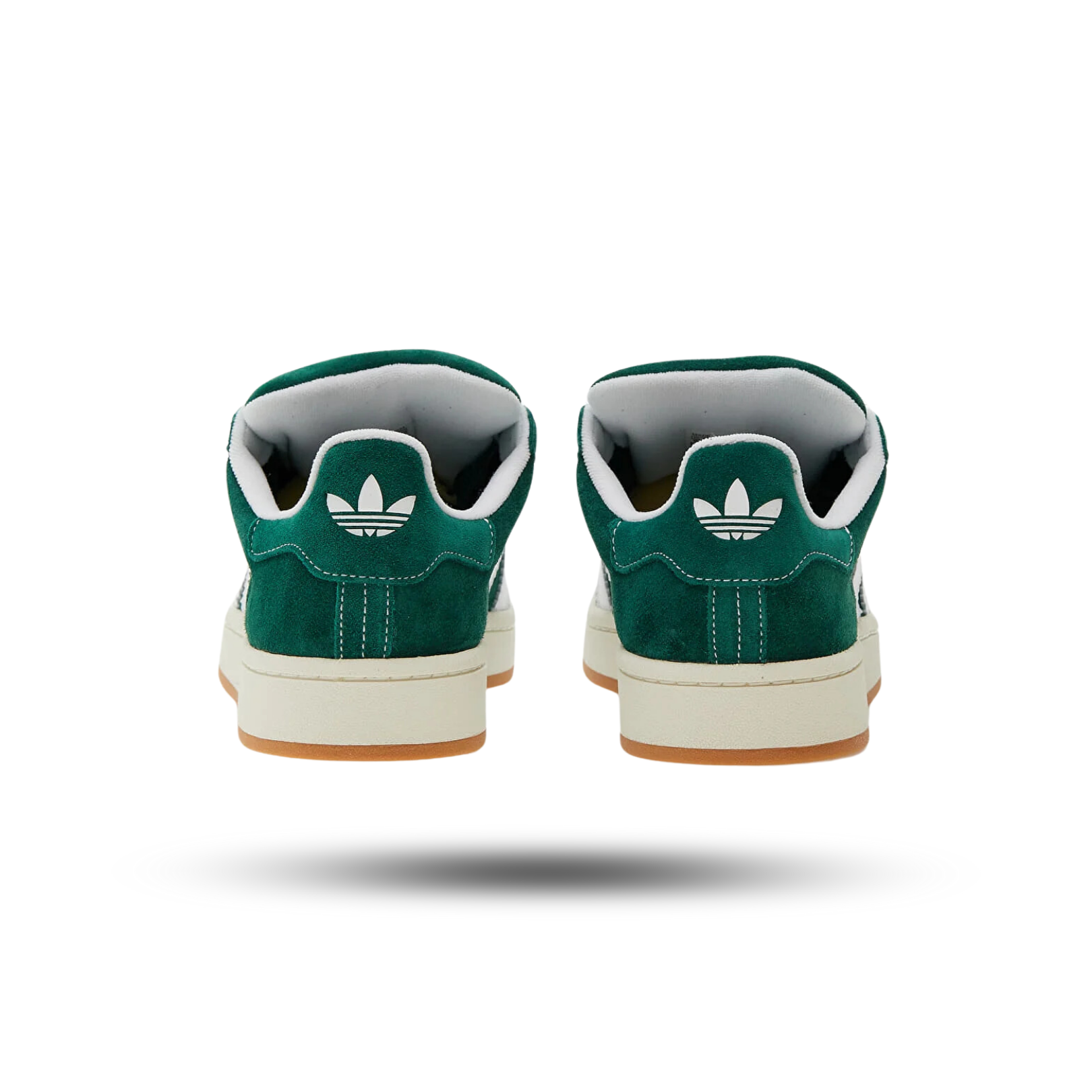 adidas Campus 00s Dark Green Cloud White mají tmavě zelený povrch z hladkého materiálu a bílé proužky po stranách. Spodek je světlý a celá bota má jednoduché, rovné švy. V balení jsou různé tkaničky, na jazyku a patě je vidět logo.